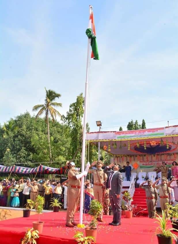 அதன்பின்னர் மூவர்ண பலூன்களை ஆட்சியர் விஷ்ணு பறக்கவிட்டார். பின்னர் திறந்த ஜீப்பில் நின்றபடி போலீசாரின் அணிவகுப்பு மரியாதையை ஏற்றுக்கொண்டார்.