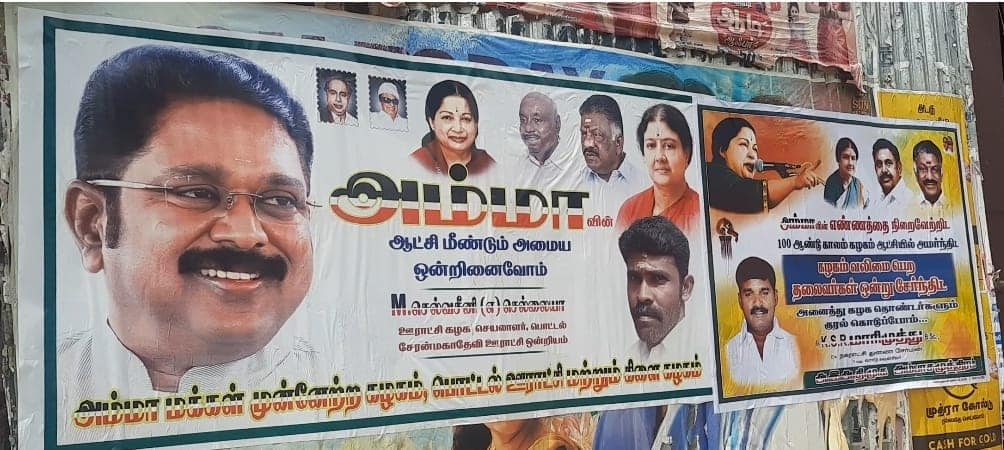இந்த நிலையில் அம்பை, கல்லிடை, சேரன்மகாதேவி மற்றும் அதன் சுற்றுவட்டார பகுதிகளில் அமமுக சார்பாக அம்மாவின் ஆட்சி மீண்டும் அமைய ஒன்றினைவோம் என்ற வசனத்துடன் முன்னாள் முதல்வர்கள் அண்ணா, எம்.ஜி.ஆர்., ஜெயலலிதா மற்றும் பாண்டியன், சசிகலா, ஓ.பி.எஸ்., டி.டி.வி தினகரன் ஆகியோர் படங்களுடன் சுவரொட்டிகள் ஒட்டப்பட்டுள்ளது பரபரப்பை ஏற்படுத்தியுள்ளது.