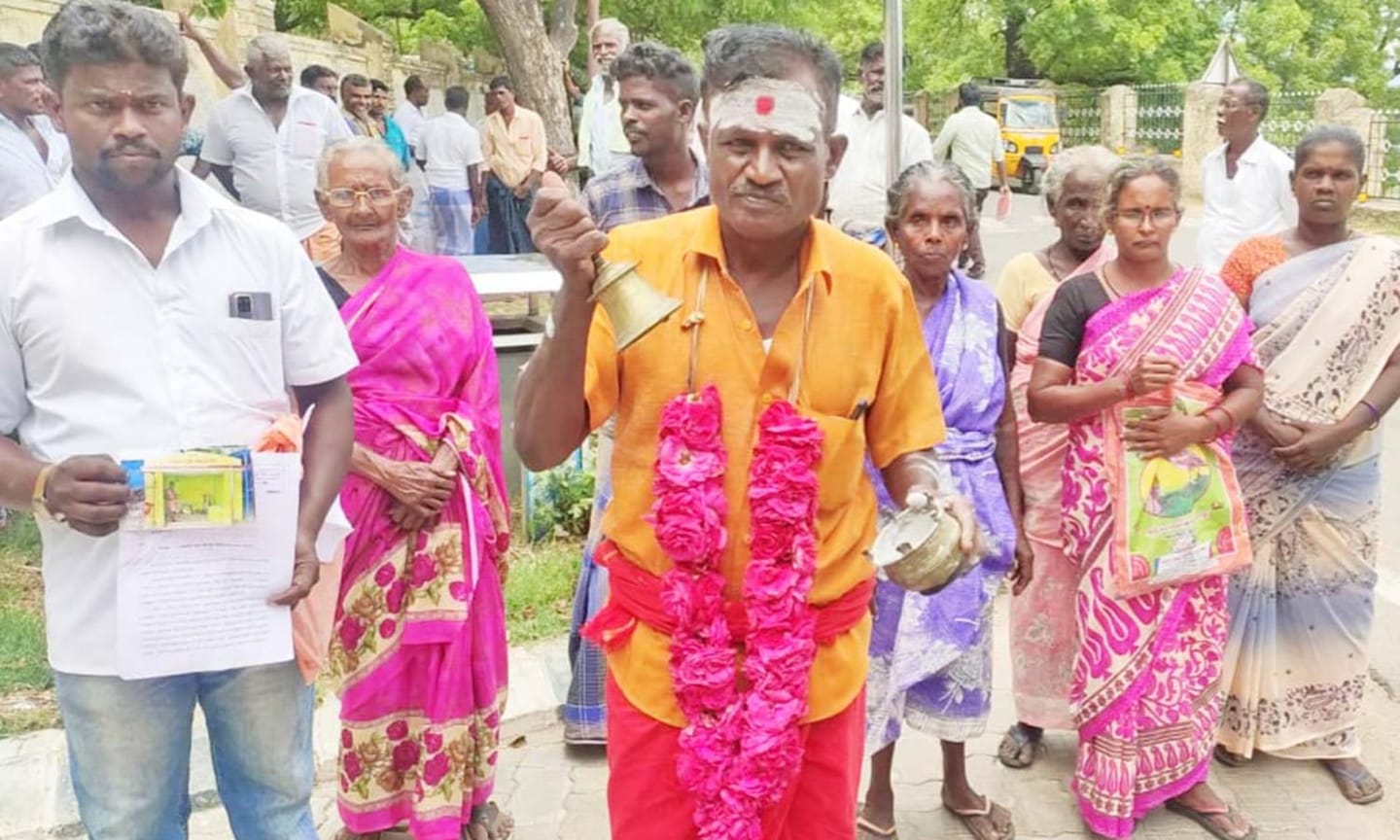 இவர் இன்று ஆட்சியர் அலுவலகத்திற்கு பூசாரி போல மாலை அணிந்தும், மணி அடித்தவாறும், சாமி ஆடியபடியும் வந்து ஒரு மனு அளித்தார்.அதில் கூறியிருப்பதாவது,