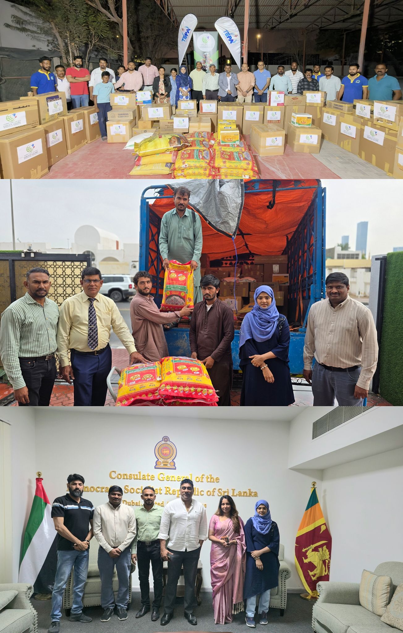 இவ்வுதவியை ஐக்கிய அரபு அமீரக அரசின் வாயிலாக நிவாரணக் களப்பணியில் கிரீன் குளோப் சார்பாக அம்மக்களுக்கு தேவையான வீட்டு உபயோகப் பொருட்களை(சுமார் 4000 kg அளவுள்ள மழைக்காலங்களில் தேவைப்படும் அத்தியாவசிய பொருட்களை) அமீரகத்தின் துபாயில் உள்ள இலங்கை தூதரகத்தில் தூதரக நிர்வாகிகள் முன்பு ஒப்படைக்கப்பட்டது . இந்நிகழ்வில் அமீரகத்திற்கான இலங்கை தூதரக நிர்வாகிகள், பொறுப்பாளர்கள், கிரீன் குளோப் நிர்வாகிகள், தன்னார்வலர்கள் என அனைவரும் இதில் முனைப்புடன் கலந்து கொண்டனர்.