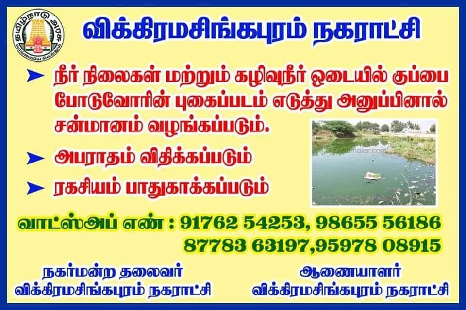 இந்த நீரோடைகளில் ஆங்காங்கே குப்பைகள் கொட்டப்பட்டு வருகிறது. இதனை தடுக்க வி.கே.புரம் நகராட்சி புதிய முயற்சியை எடுத்துள்ளது. அதாவது நீர்நிலைகள், ஓடைகளில் குப்பை கொட்டுவோரின் புகைப்படம் எடுத்து அனுப்பவோருக்கு சன்மானம் வழங்கப்படும் எனவும், அவர்களின் ரகசியம் பாதுகாக்கப்படும் எனவும், குப்பை கொட்டுவோருக்கு அபராதம் விதிக்கப்படும் எனவும், நகராட்சிக்குட்பட்ட பொதுமக்கள் குப்பை கொட்டும் சுமார் 10 -க்கும் மேற்பட்ட நகராட்சி பகுதிகளில் போஸ்டர்கள் ஒட்டப்பட்டுள்ளது.