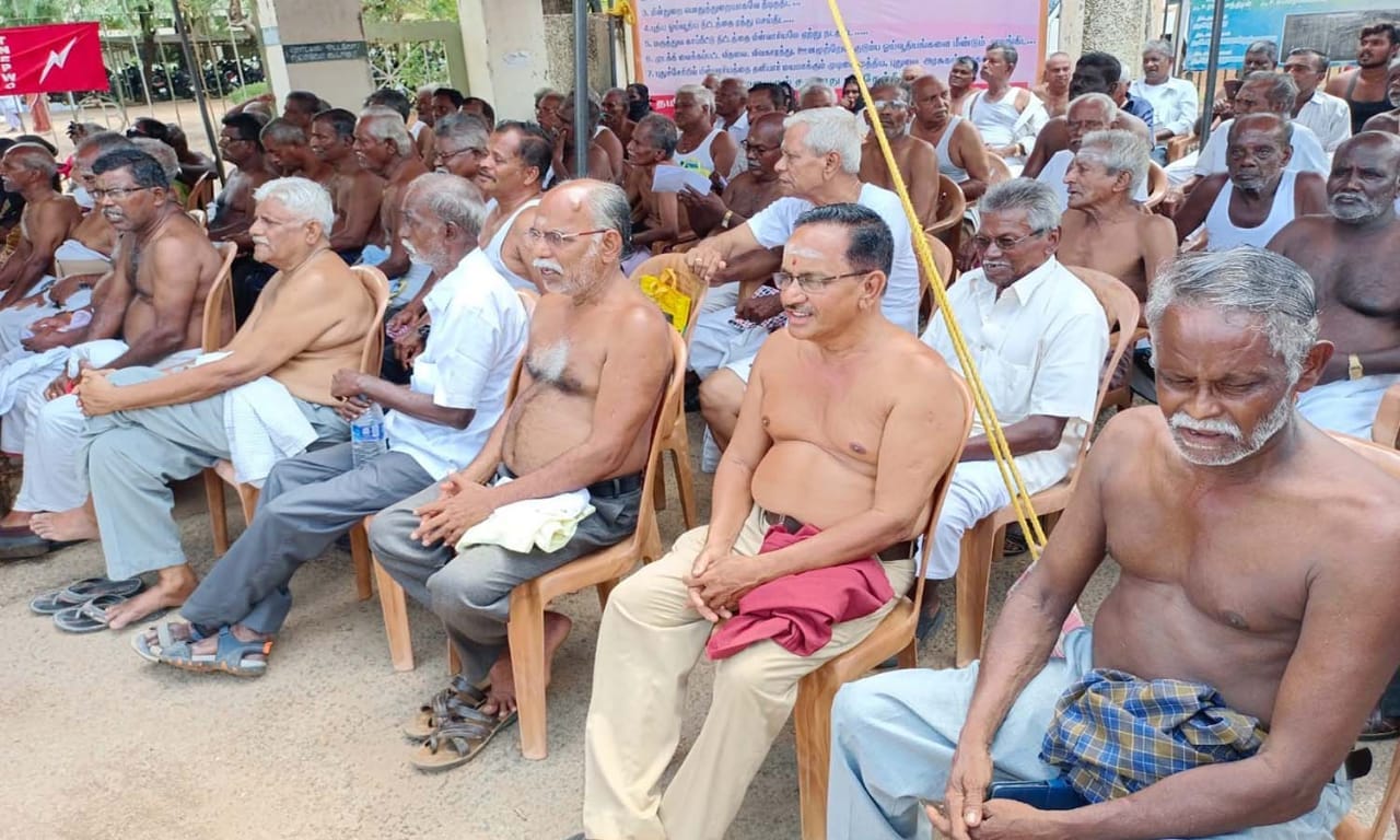 தமிழ்நாடு மின்வாரிய ஓய்வு பெற்றோர் நல அமைப்பு நெல்லை மாவட்ட நிர்வாகிகள் சார்பில் பாளை தியாகராஜநகரில் உள்ள மேற்பார்வை மின்பொறியாளர் அலுவலகம் முன்பு இன்று அரைநிர்வாண போராட்டத்தில் ஈடுபட்டனர்.